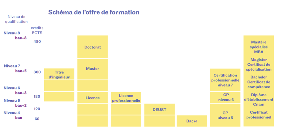 Le Cnam propose une offre de certifications (diplômes d'état, titres habilités, diplômes d'établissement) allant du niveau Bac au Bac +5.
